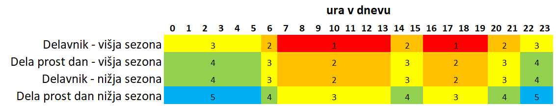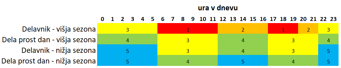 Višja dnevna tarifna postavka (VT) se obračunava od ponedeljka do petka od 6.00 do 22.00. V obdobju, ko velja poletni čas, se za končnega odjemalca, ki nima krmilne naprave z možnostjo programske nastavitve prilagajanja na poletni čas, višje dnevne tarifne postavke se obračunavajo od 7.00 do 23.00.